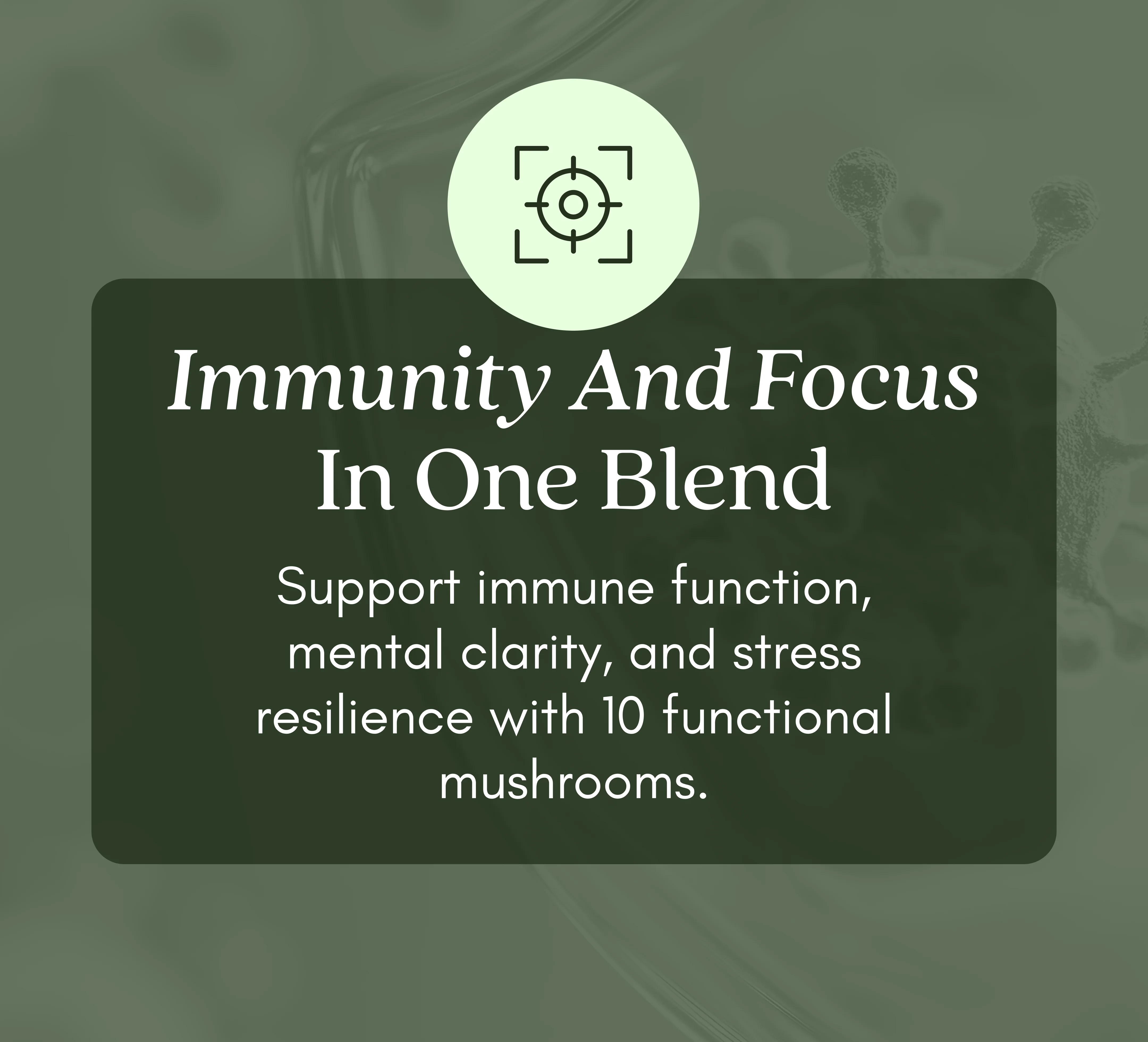 Immune support, mental clarity, stress resilience, 10 mushrooms in one blend.