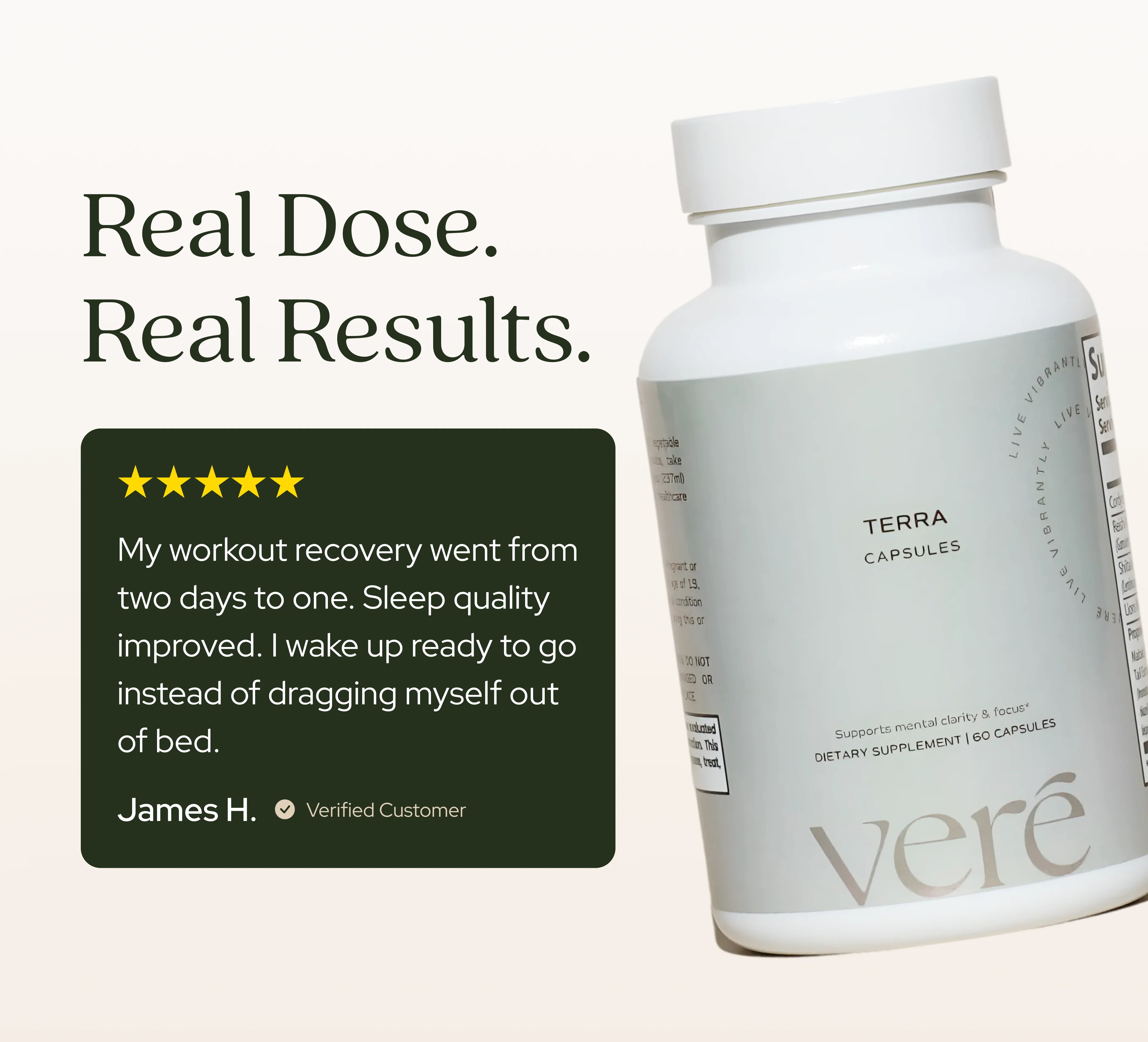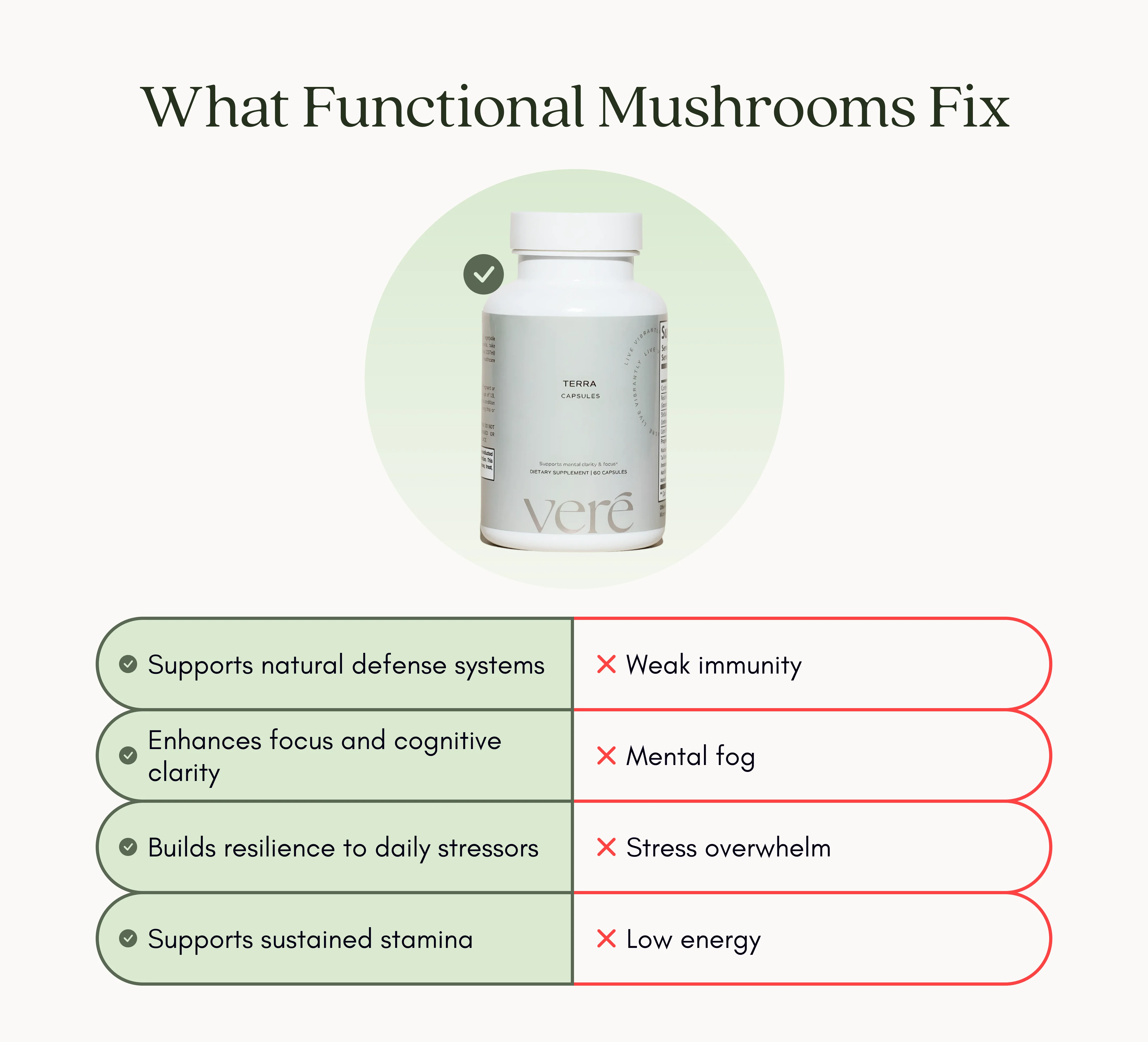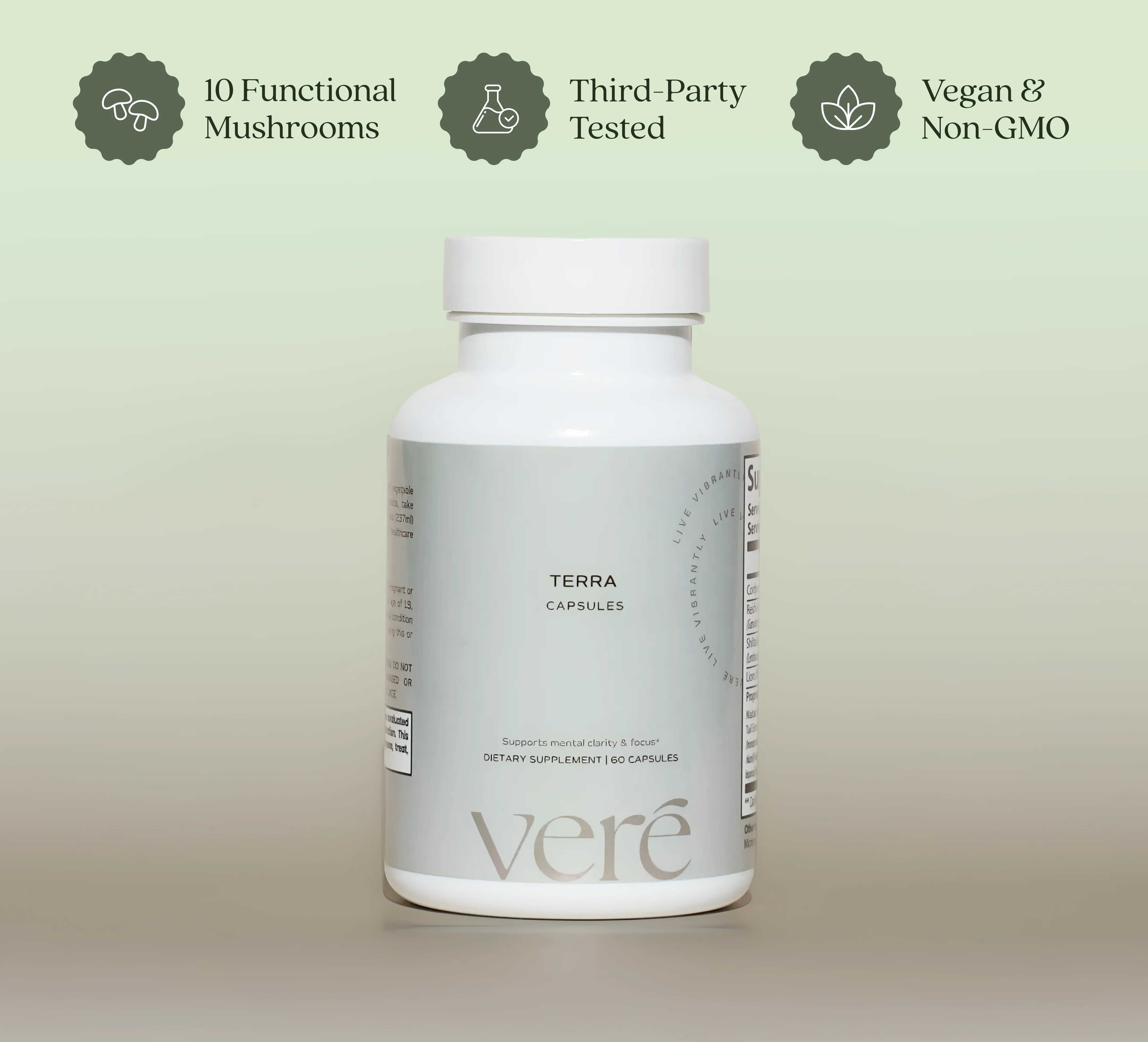 Most mushroom supplements under-dose or blend too many species at ineffective amounts. Vére Terra uses 10 functional mushrooms at clinical doses of 266mg each—ensuring your body gets what it needs for immune defense, mental clarity, and stress resilience.